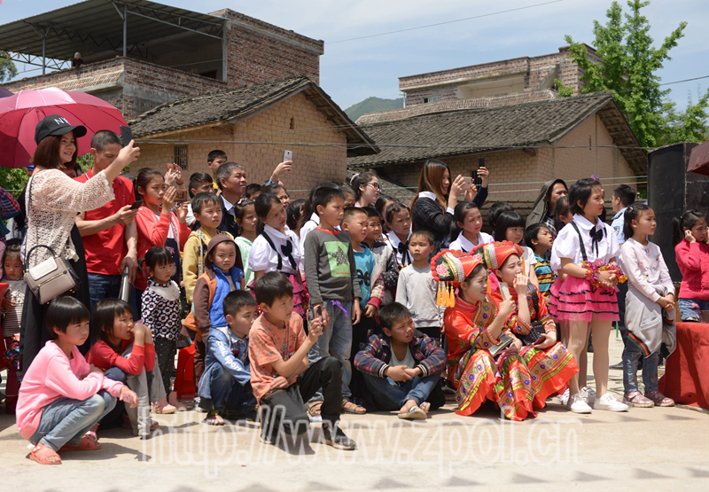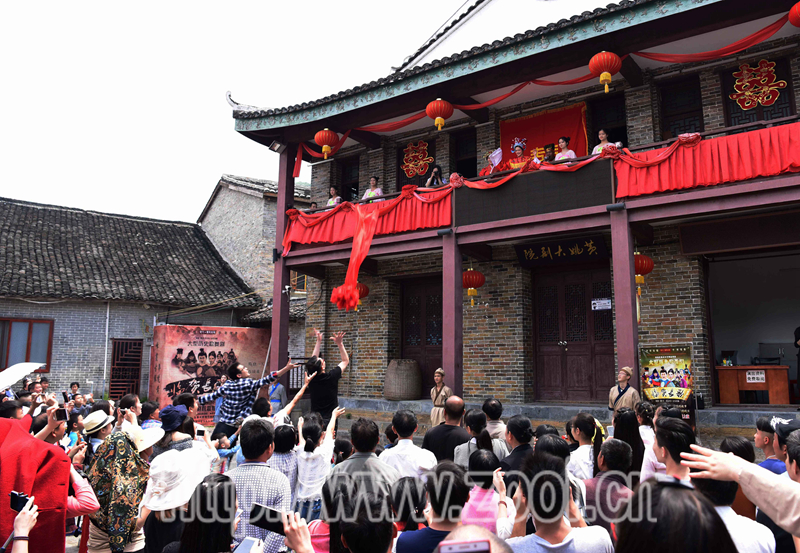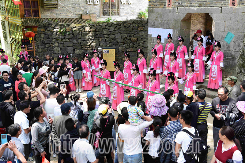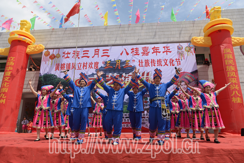当天,在黄姚镇凤立村还举行了传统村落"壮族三月三"传统节日文艺演出活动。各地游客和本地群众约1000人相聚在此,参加了三人板鞋、打竹枪、抛绣球等传统游戏,品尝壮乡人的特色美食,载歌载舞,欢度佳节。