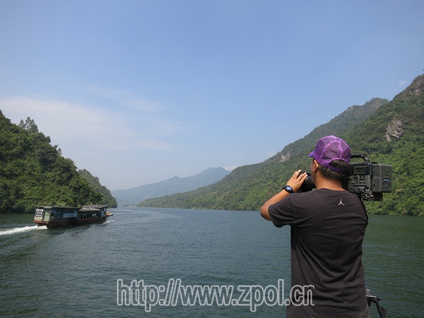 中央电视台摄制组在桂江拍摄“猴王绝唱(远景)”等的情景。