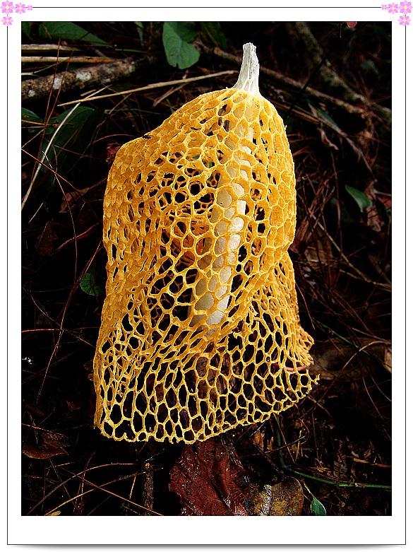 在路底下发现了一种奇特的野菌——开始没有看清楚时,我以为它是蜂窝,因为正好有一只好大的蜂停在上面,我不得不小心翼翼地靠近它。 我轻轻地把那只大蜂儿赶走,移开上面的树枝,然后拍下了这朵野菌。干脆就叫它“金钟罩”吧 。