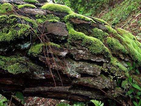 陡坡上向下斜着生长的松树,那厚厚的树皮,饱含着岁月的沧桑, 柔绿的苔藓依附其间,相生相容,共同见证着这深山的变花。