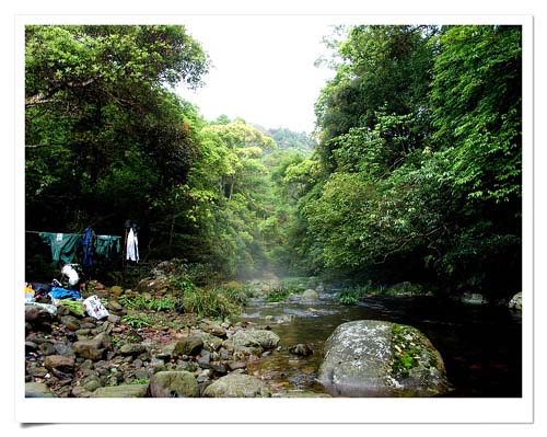 下雨,下雨,还是下雨,我们望着窗外的雨声不停地下着,心里早已飞到了七冲——那时时诱惑着我们的心我们的胃的原始森林。莽莽翠绿,老藤遒劲,溪水淙淙……,在原始森林露宿,特别是雨中,那又是怎样的快乐呢?心动不如行动,买了一切防雨的装备和生活必需品,我们一行四人冒雨踏上了去七冲的行程。