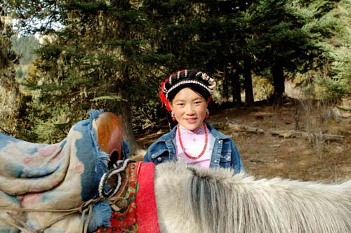 牵马的藏族姑娘,长得眉目清秀。我无法想象如果我骑在马上,她牵着,我们一路无语,或者她唱着家乡的民歌,她的辫子轻轻晃动着,呵呵,是不是觉得像在做梦。
