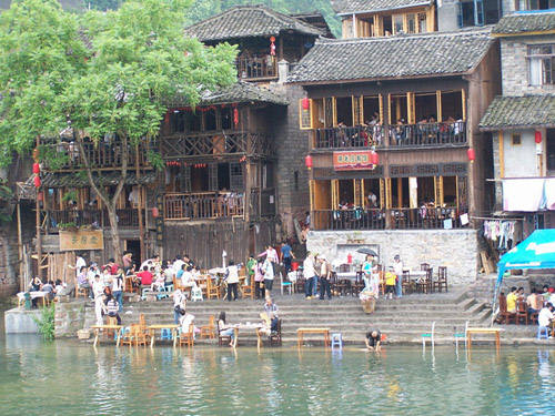吊脚楼似乎是凤凰应该有的。我也以为还可以看到在江边高高的吊脚楼,而满眼看到的,也还是楼。楼的屋檐回廊也似乎是当年的样子,而吊脚却完全地成为了现代建筑的模式,零星的几根支柱似乎还在想向看到它的人说明它的吊脚的特色。