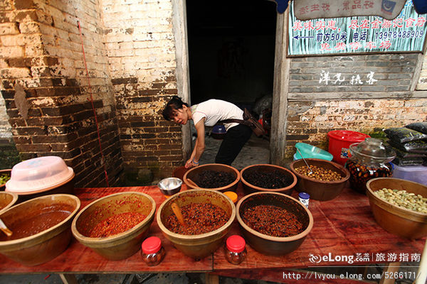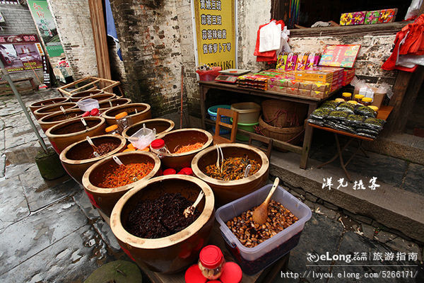 老板娘把黄姚的特产酱料从里屋搬出来,准备开张。黄姚这里盛产各种酱菜,尤其是以各种口味的豆瓣酱最出名,来古镇旅游的人们总会顺手捎回去几瓶,远离他乡的游子更是会把它带到自己拼搏的城市里,了却自己的乡愁。有点店家还在淘宝开了小店,搞起来网购。