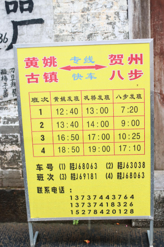 广州往贺州的高铁票还是挺好买的,我们是提前两星期买了广州南—贺州高铁票,但贺州—广州南的高铁票就很难买,曾想过坐汽车回来,不过坐汽车起码得折腾大半天,后来还是机智的Rita提议我们买从桂林北—广州南的,毕竟桂林北是始发站,票可能多些,事实确实如此。这样来回贺州交通问题解决了,接下来考虑贺州到黄姚的交通了,看了蝉游记和蚂蜂窝不少游记和tips,99%建议在贺州西站坐汽车去黄姚。而事实是出了贺州站,我们一行四人打的去黄姚了,因为在西站坐普通大巴30元/人,车程2—3小时(网上看到的数据,没有实际验证),打的210元,平均每人52.5元,车程1小时。我们行李比较多,所以觉得打的多快好省。后来回去的时候我们也联系司机大姐让她从黄姚接我们到贺州坐高铁回广州。