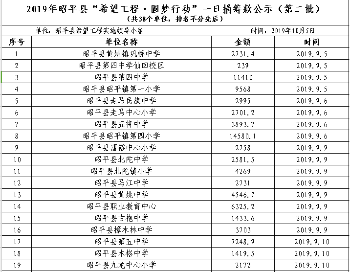 "2019年昭平县“希望工程·圆梦行动”一日捐筹款公示(第二批) 来源:|0 作者:adminyys 发布时间:2019-10-05 19:32:06 浏览次数: 次 字体:A- A+ 分享到: 打印正文 关闭本页