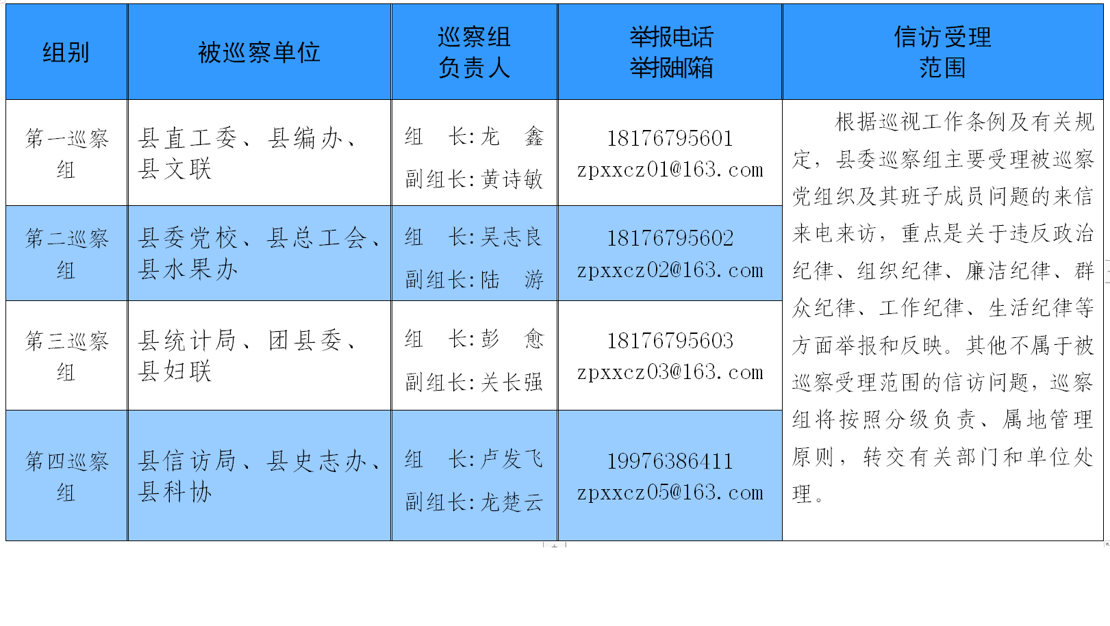 以上举报电话在工作日8:00—12:00,15:00-18:00开通,群众如实反映领导干部有关问题受法律保护,以上联系方式有效期至本轮巡察工作结束,热忱欢迎广大党员干部群众积极参与巡察工作,客观公正反映问题。根据巡察工作职责,有关个人诉求、征地拆迁、涉法涉诉等问题不属于本次巡察受理范围,巡察组将按照分级负责、属地管理原则,转交有关部门和单位处理。