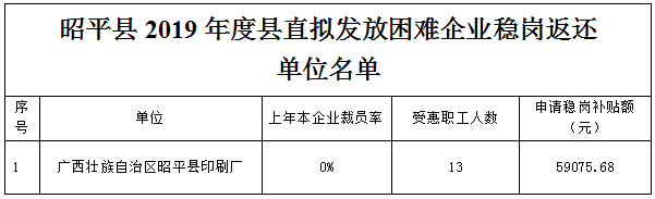昭平县2019年度县困难企业稳定就业岗位补贴拟发放单位名单公示(第三批)