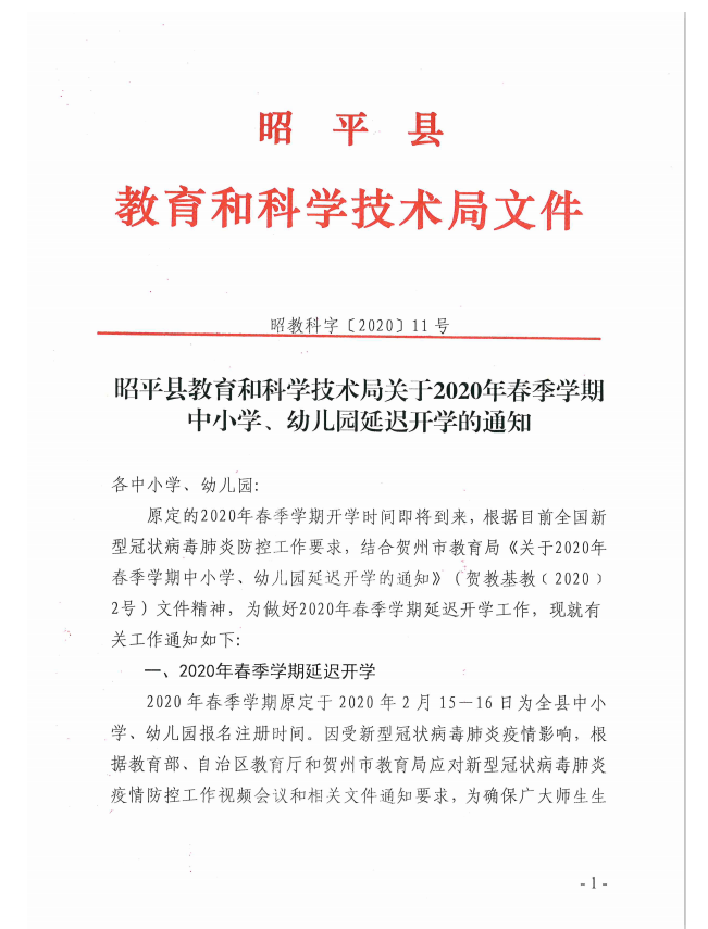 昭平县教育和科学技术局关于2020年春季学期中小学、幼儿园延期开学的通知 来源: 作者:adminyys 发布时间:2020-02-13 15:29:22 浏览次数: 次 字体:A- A+ 分享到: 打印正文 关闭本页