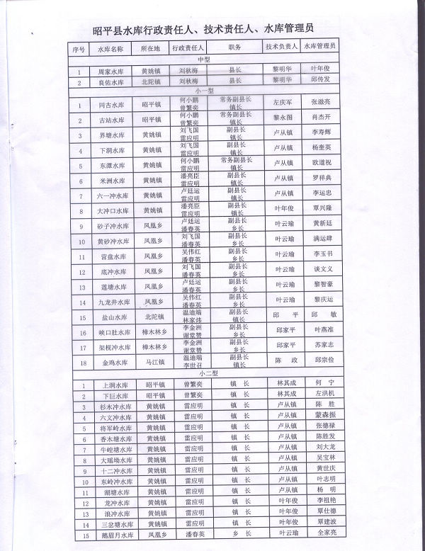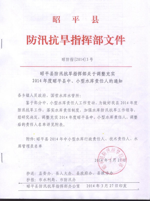 昭平县防汛抗旱指挥部关于调整2014年度中、小型水库责任人的通知