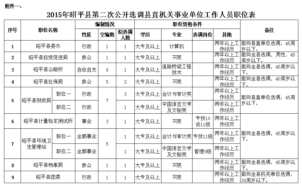 各选调单位的职位、职位资格条件等情况请查询《2015年昭平县第二次公开选调县直机关事业单位工作人员职位表》。