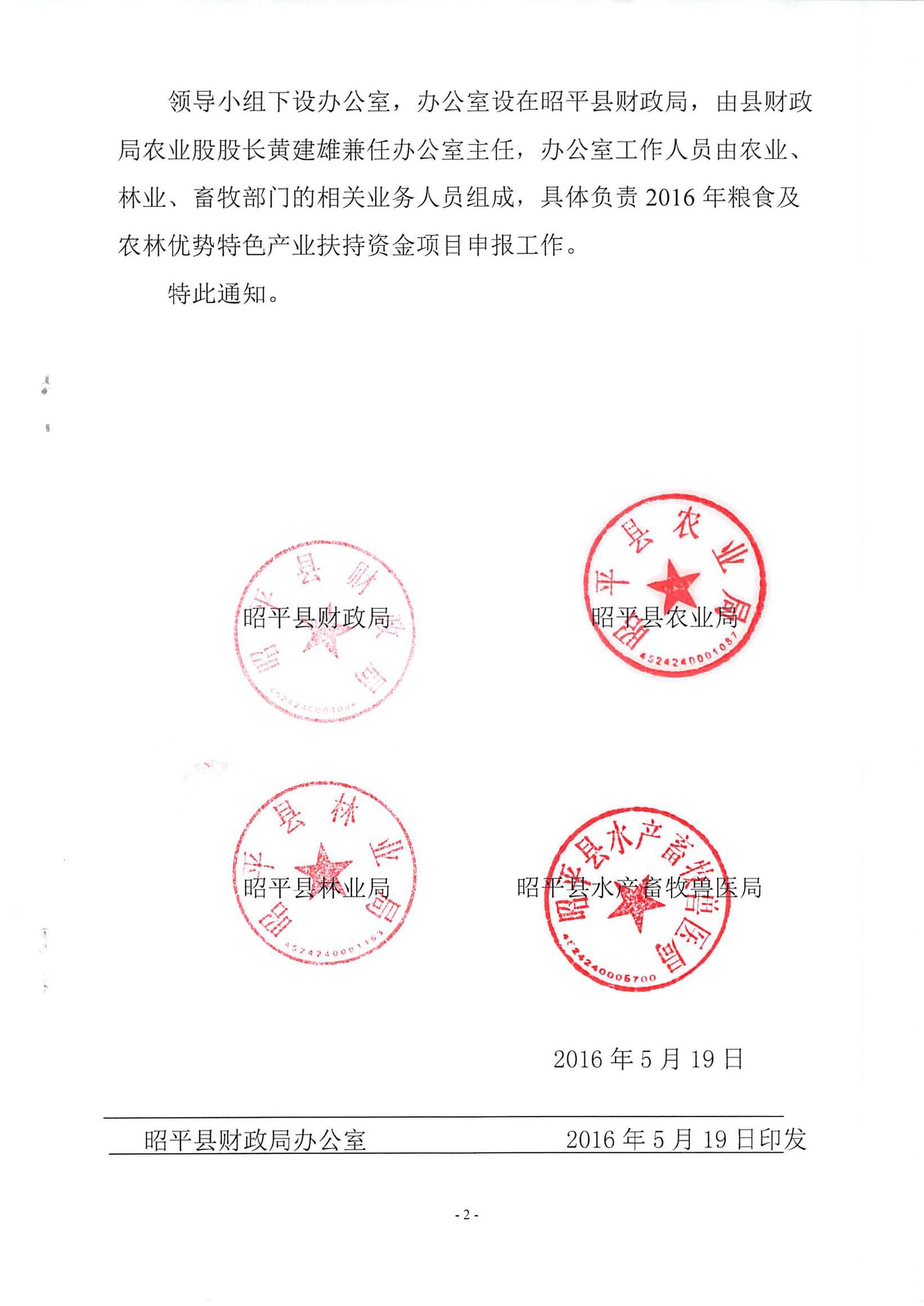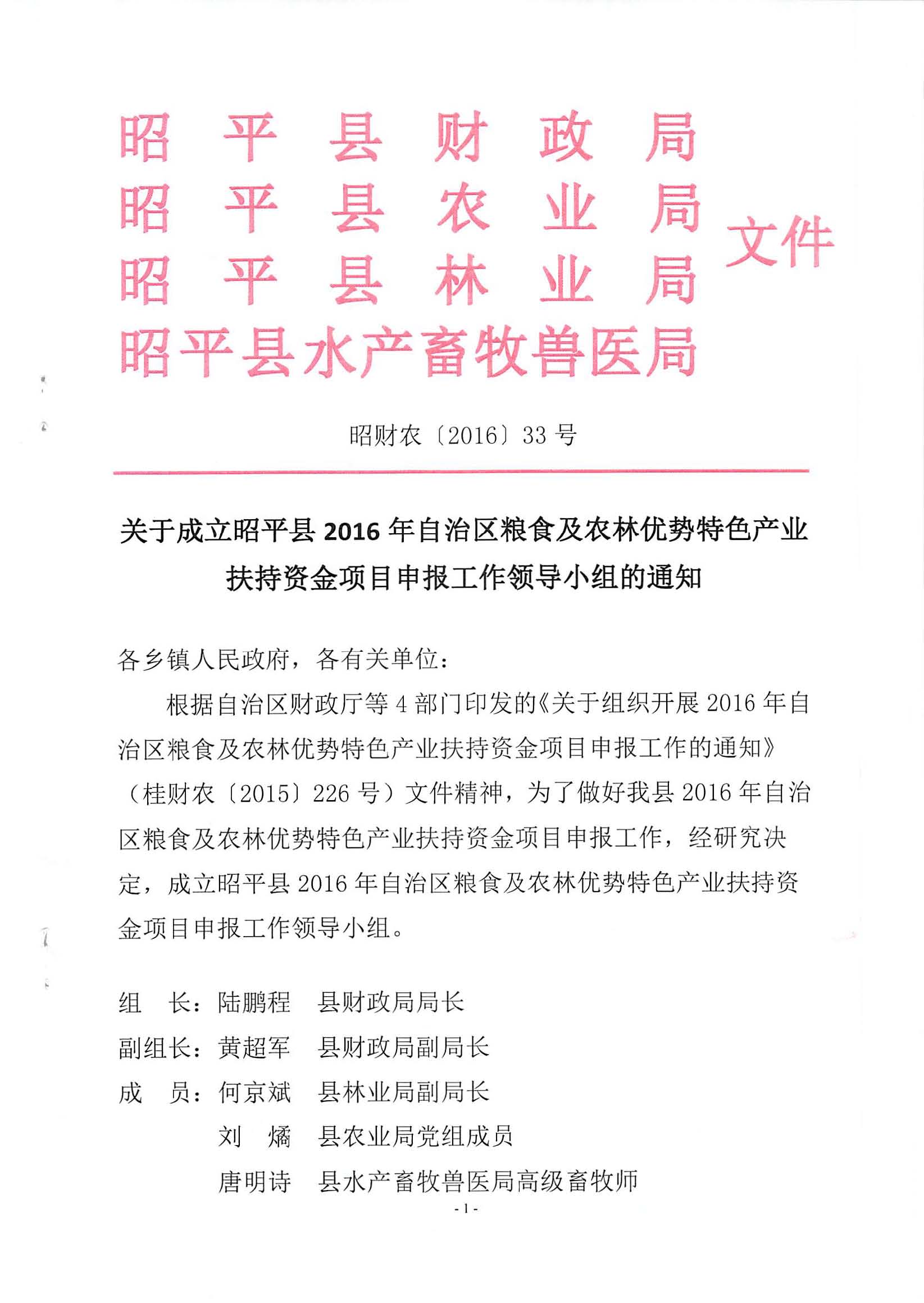 关于成立昭平县2016年自治区粮食及农林优势特色产业扶持资金项目申报工作领导小组的通知 来源: 作者: 发布时间:2016-05-27 16:14:19 浏览次数: 次 字体:A- A+ 分享到: 打印正文 关闭本页