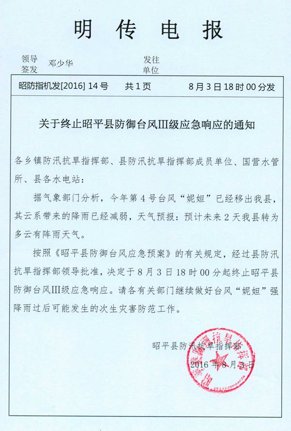 关于终止昭平县防御台风Ⅲ级应急响应的通知