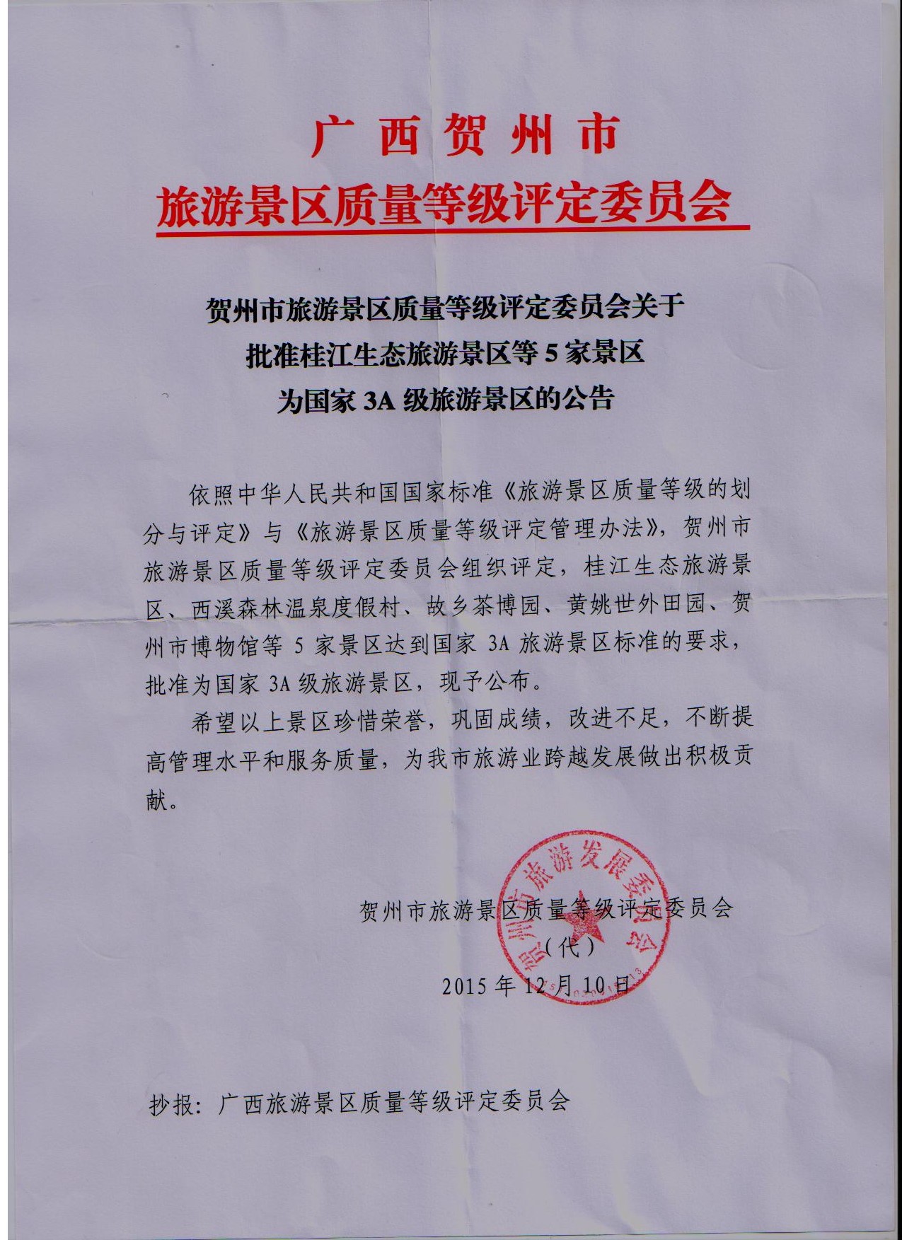 附件:《贺州市旅游景区质量等级评定委员会关于批准桂江生态旅游景区等5家景区为国家3A级旅游景区的公告》