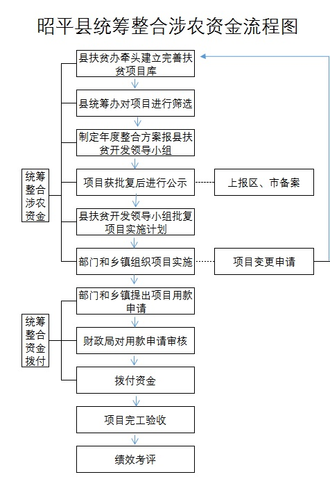 制定了《昭平县统筹整合使用财政专项资金实施方案》和《昭平县统筹整合使用财政专项资金管理办法》,统筹资金项目按年度统筹方案分部门实施,资金由财政部门统一管理。实行"多个渠道进水、一个龙头放水"的管理模式。各级财政部门下达到各部门的涉农专项资金优先满足统筹资金任务的要求。主要流程如下:县扶贫办依托十三五扶贫规划,根据各乡镇和部门上报的项目,完善和充实扶贫项目库县统筹办按照全县脱贫攻坚的需要对项目进行筛选制定年度涉农资金整合使用方案上报县扶贫开发领导小组审定获批复后进行项目和资金公示上报自治区、市备案县扶贫领导小组批复项目实施计划给有关部门和乡镇部门和乡镇组织实施项目。统筹资金全部实行国库集中支付,资金拨付流程:由项目主管部门或乡镇申请,财政局审核拨付;对到户到人的资金,直接支付到贫困户一卡通;对项目资金,实行授权支付或直接支付的方式支付给劳务提供者或供应商;对完工项目组织验收;项目的实施列入乡镇和部门的绩效考评。