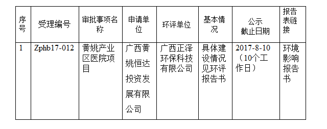 黄姚产业区医院项目环评审批 受理情况公示 来源: 作者:adminyys 发布时间:2017-07-24 10:32:00 浏览次数: 次 字体:A- A+ 黄姚产业区医院项目环评审批受理情况公示 注:报告表及其他资料由行政许可申请人提交,项目业主和环评机构对公示内容负责。 报告书公示版可查看链接或者到县环保局环境管理股查阅。 公示时间: 2017年7月24日-2017年8月10日(10个工作日)公众反馈意见的联系方式,联系电话:0774-6698628。 通讯地址:昭平县环境保护局环境管理股(昭平镇河西东路213号) 分享到: 打印正文 关闭本页
