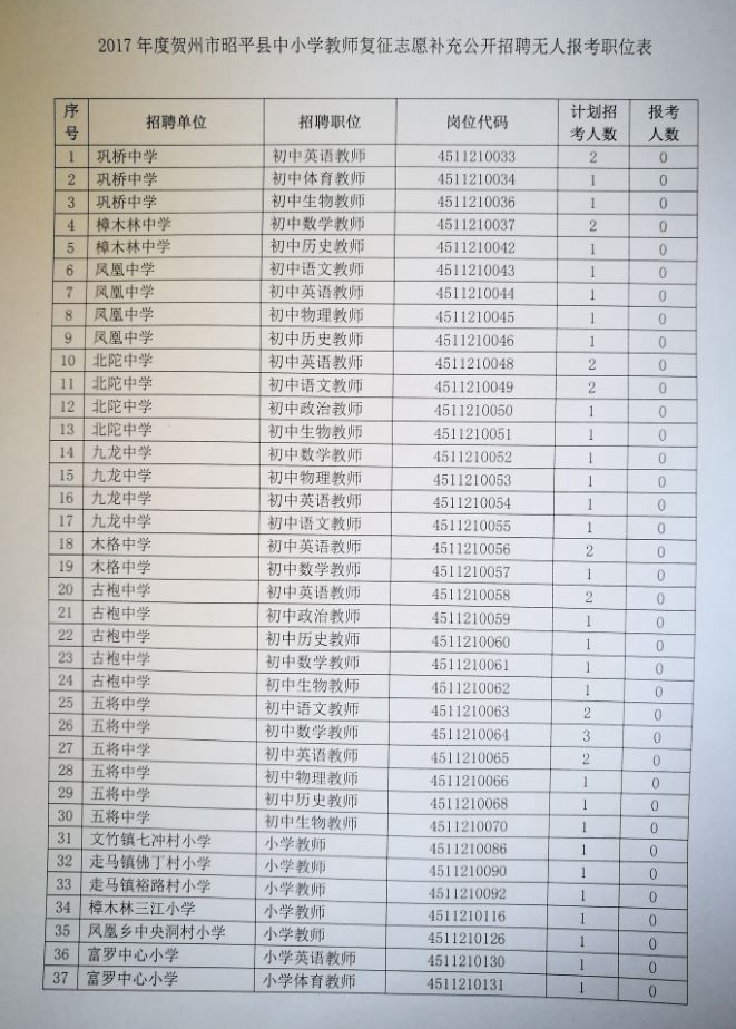 2017年度贺州市昭平县中小学教师复征志愿补充公开招聘无人报考职位表 来源:县人社局 作者:adminyys 发布时间:2017-08-22 10:14:15 浏览次数: 次 字体:A- A+ 分享到: 打印正文 关闭本页