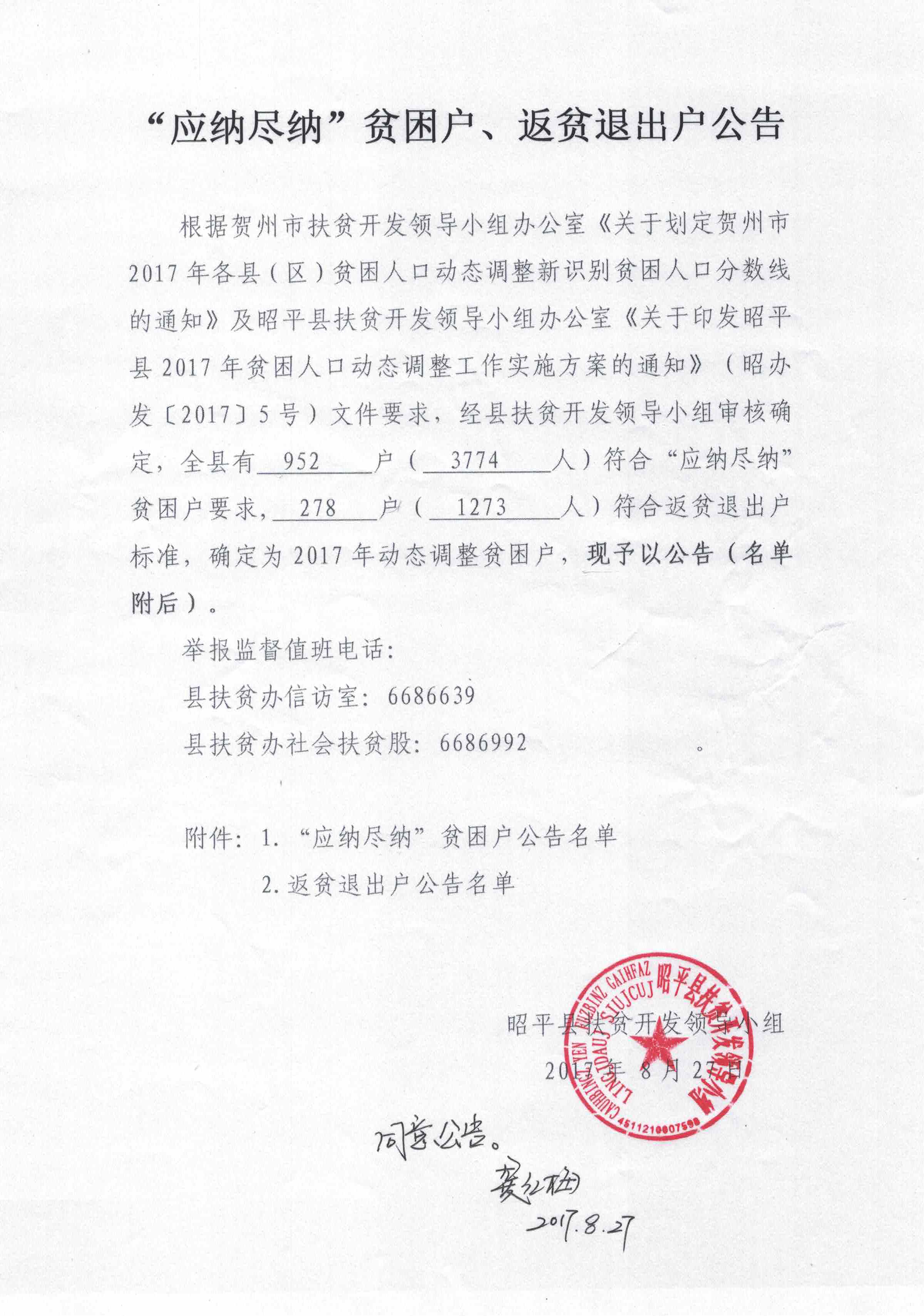 昭平县“应纳尽纳”贫困户、返贫退出户公告 来源:县扶贫开发领导小组 作者:adminyys 发布时间:2017-08-28 16:51:51 浏览次数: 次 字体:A- A+ 附件1:昭平县“应纳尽纳”贫困户<64分(含)以下>名册http://www.zpol.cn/uploadfile/2017/0828/20170828050155644.xlsx 附件2:昭平县返贫贫困户(退出户)名册 http://www.zpol.cn/uploadfile/2017/0828/20170828050213589.xlsx 分享到: 打印正文 关闭本页