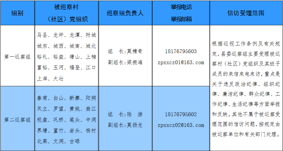 巡察期间,为便于党员干部群众反映情况,巡察组将安排专人负责接待群众来信来访,同时开通信访举报电话、邮箱,受理投诉、举报。各巡察组负责的巡察村(社区)党组织、巡察组负责人和举报电话如下:
