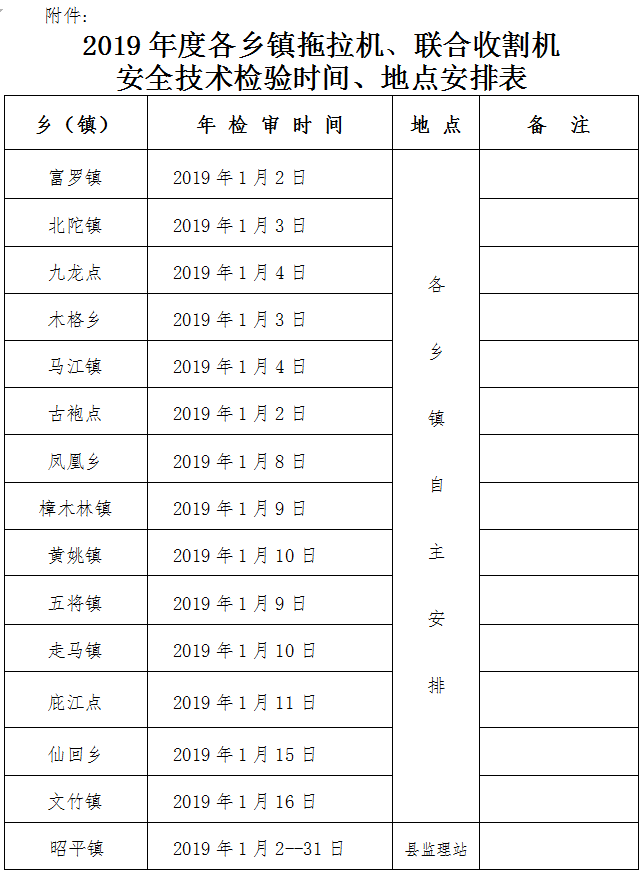 附件:2019年度各乡镇拖拉机、联合收割机安全技术检验时间、地点安排表
