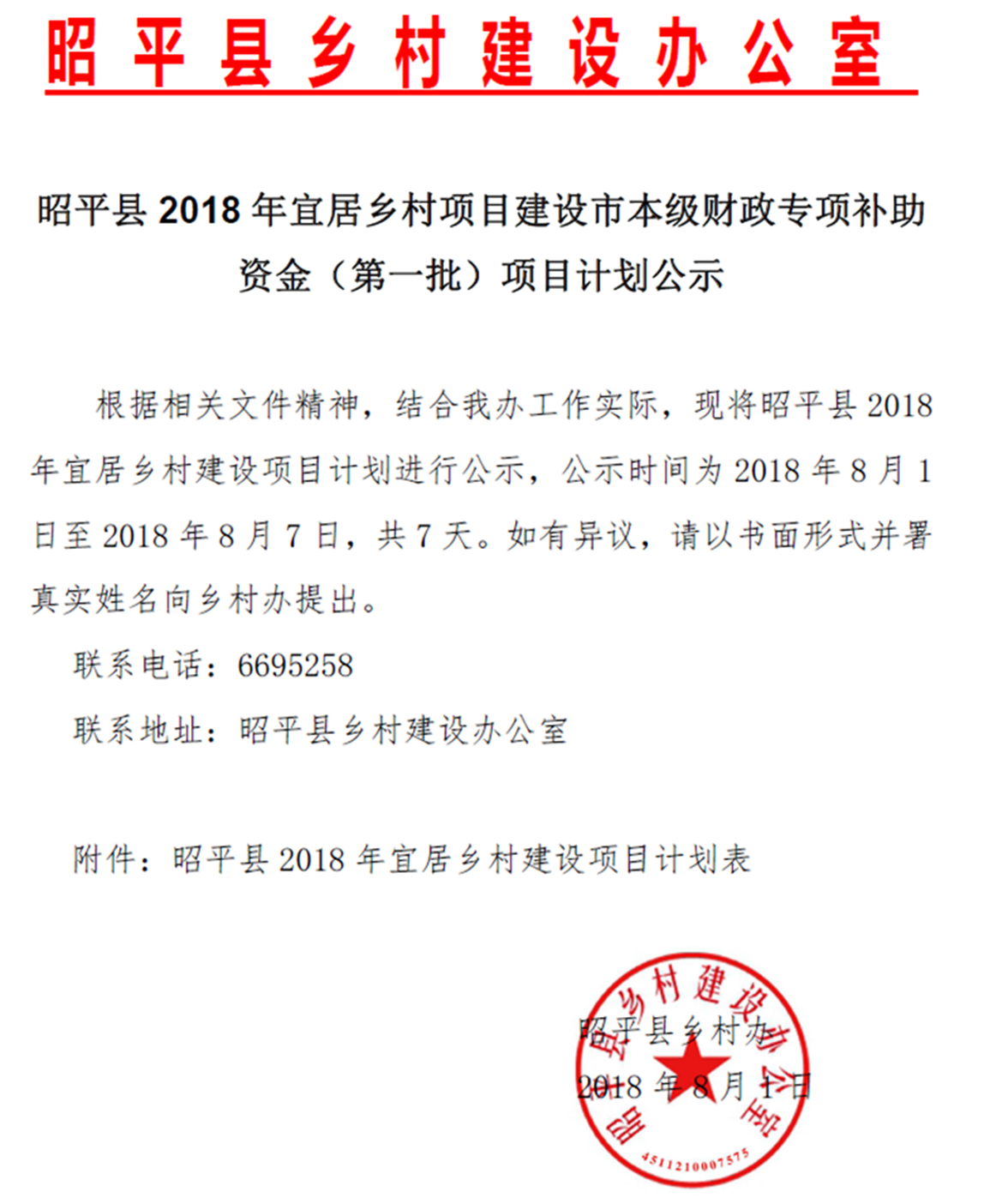 昭平县2018 年宜居乡村项目建设市本级财政专项补助 资金(第一批)项目计划公示 来源: 作者:adminyys 发布时间:2018-08-01 15:54:00 浏览次数: 次 字体:A- A+ 附件: http://www.zpol.cn/uploadfile/2019/0102/20190102040046527.doc 分享到: 打印正文 关闭本页