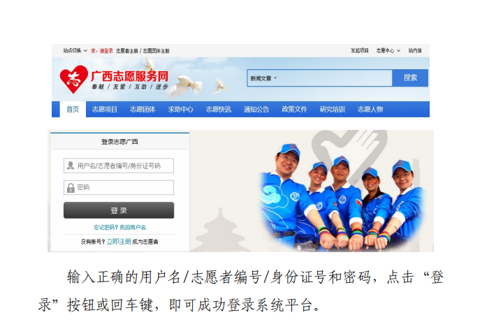 第一种方式:打开广西志愿服务网:http://gx.chinavolunteer.cn/。点击左上角“志愿者注册”,进入注册页面。