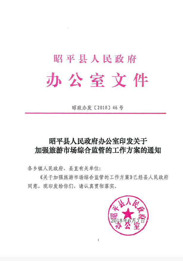 昭平县人民政府办公室印发关于加强旅游市场综合监管的工作方案的通知 来源:县政府办 作者:adminyys 发布时间:2018-06-13 10:47:00 浏览次数: 次 字体:A- A+ 分享到: 打印正文 关闭本页