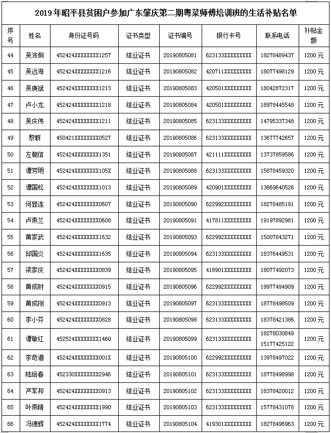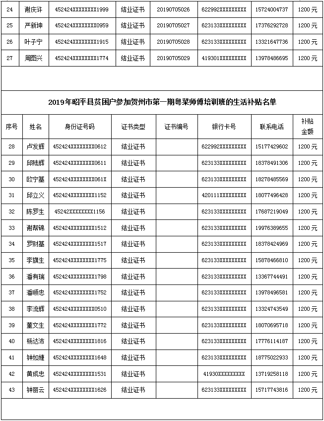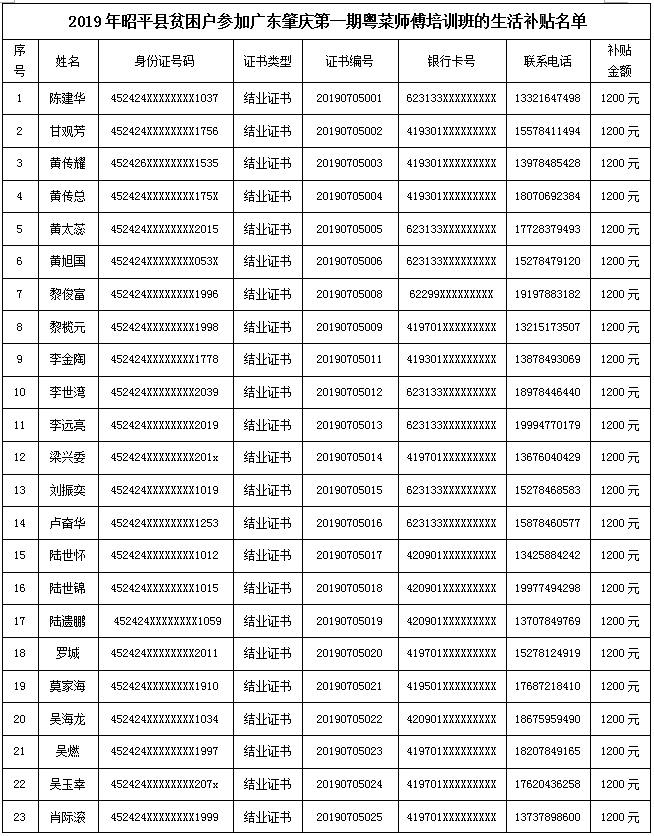 昭平县人力资源和社会保障局关于发放第一批贫困劳动力参加职业技能培训期间生活费补贴的人员名单公示