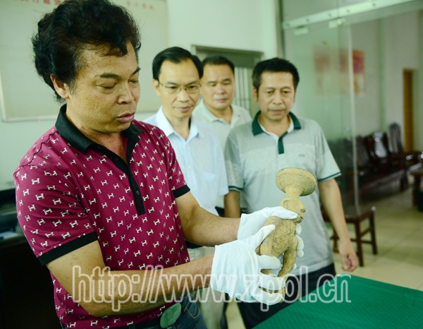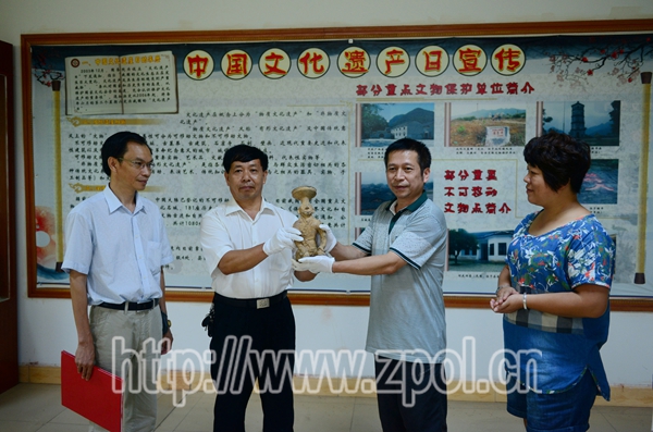 市民唐宗书(左二)把兽面人身陶俑灯捐赠给昭平文馆所。