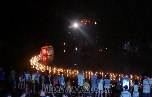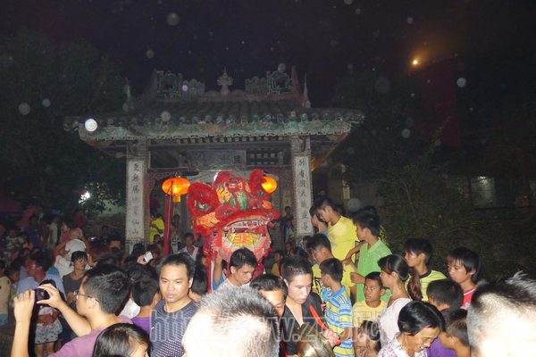 8月21日晚上8点,古镇居民将制作好的柚子灯放入古镇带龙桥河里,前方由小船引导并慢慢顺着河水向下游飘流,从醉仙榕一直漂到兴宁庙,宛如一条长长的火龙蜿蜒于水面。岸上敲着鼓声、锣声的舞狮队伍在沿路庙宇进行参拜。鞭炮声、欢笑声和烟花绚烂的夜空,使得宁静的姚江喧腾起来了。