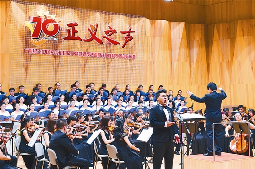 本报南宁讯 (记者/魏恒)9月1日晚,由自治区党委宣传部、自治区直属机关工委、自治区文化厅、自治区总工会主办,广西演艺集团协办的“正义之声——纪念中国人民抗日战争暨世界反法西斯战争胜利70周年音乐会”在广西音乐厅上演。自治区领导彭清华、陈武、陈际瓦、危朝安、刘新文、李康,与劳动模范、先进工作者、部队官兵、抗战先烈家属及社会各界代表一同到场聆听。
