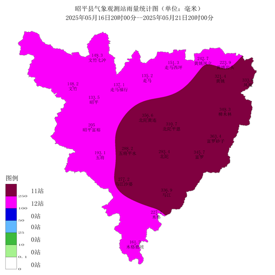 受高空槽、低层切变线和偏南急流共同影响,5月16-21日(共5天)昭平县出现了暴雨到大暴雨。根据全县24个气象站统计,5月16日20时至21日20时,累计雨量大于250.0毫米11站,最大降雨出现在富罗砂子(363.4毫米),100.0~249.9毫米13站(附图1)。