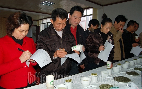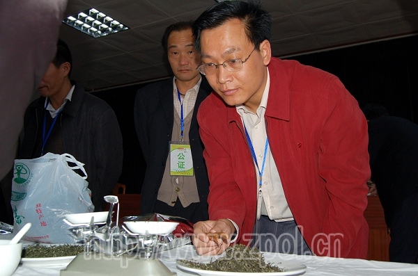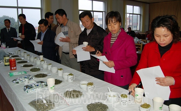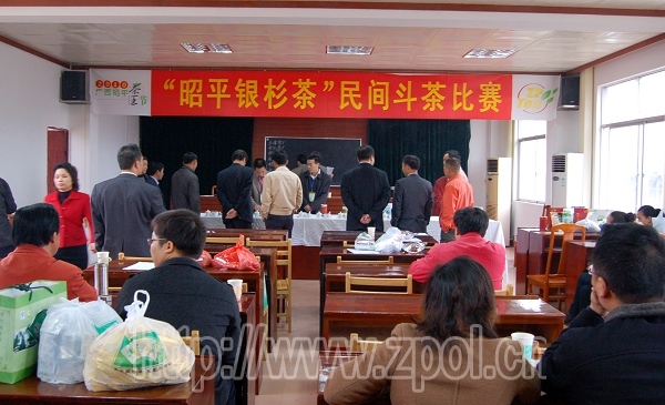 4月3日,2010年广西(昭平)茶王节各项赛事继续进行,在县农业局四楼培训中心的“昭平银杉茶”民间斗茶比赛现场,来自我县20多家参赛企业代表正在这里切磋茶艺,争夺本次比赛的桂冠。经过紧张角逐,亿健茶业有限公司、将军红茶厂分别摘得绿茶组和红茶组的第一。