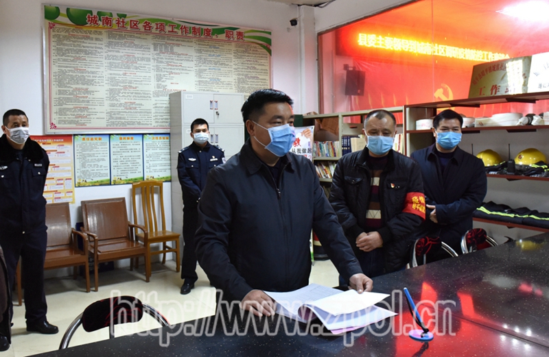2月5日,县委书记、县新型冠状病毒感染的肺炎疫情防控工作领导小组组长刘飞国到昭平镇城南社区、城西社区、城北社区、城东社区检查指导新型冠状病毒感染的肺炎疫情防控工作。并看望坚守防疫一线的社区干部,对他们始终坚守在一线辛勤工作表示慰问和感谢,叮嘱他们在守好疫情防控防线的同时,加强自身安全防护。