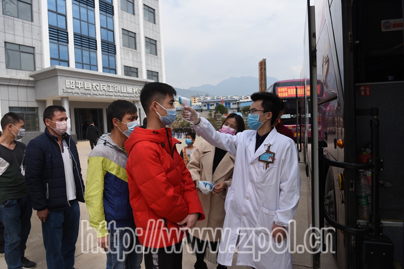 图为医生正在对外出务工人员进行体温检测。