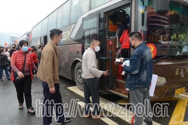 图为2月28日,昭平籍农民工免费乘坐返岗复工专用包车返岗。