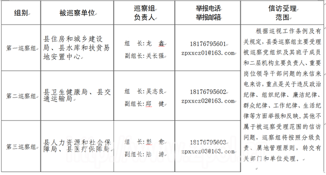 根据要求,县委巡察组将坚持以习近平总书记巡视工作思想为指导,认真贯彻落实习近平总书记关于“五个持续”的重要要求,深化政治巡察。重点检查被巡察党组织坚持党的全面领导、加强党的政治建设、落实全面从严治党和巡视巡察反馈问题整改情况,特别是在开展脱贫攻坚工作中责任落实、政策宣传、工作作风情况。着力发现党组织、单位领导和干部在贯彻落实脱贫攻坚战略部署中,是否存在打折扣、搞变通、做选择,是否存在不作为、慢作为、乱作为的问题,以及落实中央第二巡视组对广西开展脱贫攻坚专项巡视反馈意见整改工作中存在的问题。巡察期间,为便于党员干部群众反映情况,巡察组将安排专人负责接待群众来信来访,同时开通信访举报电话、邮箱,受理投诉、举报。各巡察组负责的被巡察单位、巡察组负责人和举报电话如下: