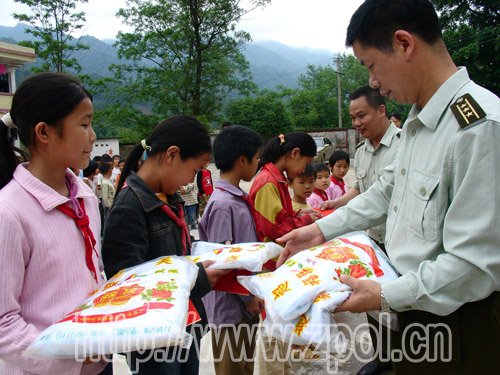 武装部部长朱经武.政委谢军为贫困学生送上助学金和生活用品。