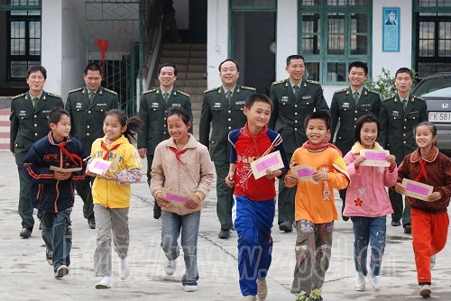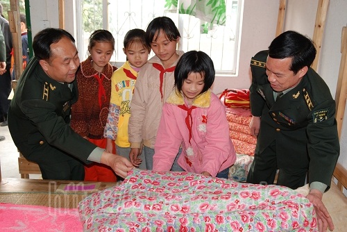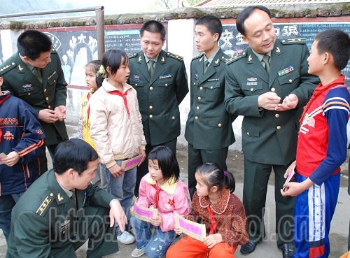 县人武部官兵“一帮一”助学进山村 来源: 作者:Admin 发布时间:2009-12-09 16:18:00 浏览次数: 次 字体:A- A+ 2月23日,马圣村小学7名贫困孩子收到县人武部官兵送来的助学金,高兴不已。县人武部官兵以雷锋为榜样,视驻地的贫困孩子为亲人,掏出自己工资,开展“一帮一”助学活动。近十年来,该部官兵先后资助了100多名农村贫困孩子完成了学业。 (喻湘泉 龚立荣) 2月23日,马圣村小学,县人武部官兵在教受资助的山村贫困女孩整理内务。 2月23日,马圣村小学,县人武部官兵在与受资助的山村贫困孩子谈心。 分享到: 打印正文 关闭本页