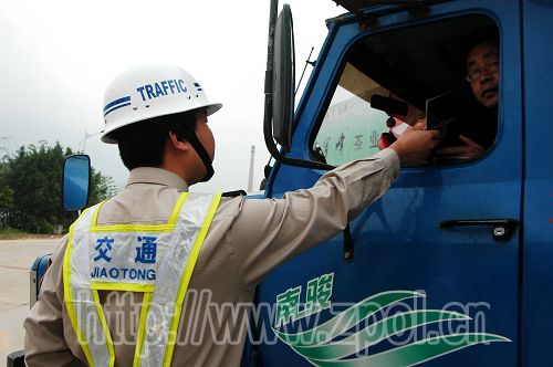执法人员检查机动车辆车主的证件。