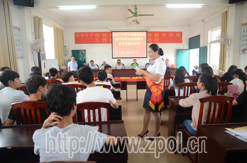 当天下午,为进一步加大防范非法集资宣传力度,引导学生树立正确投资理财观念,防范和打击非法集资宣传活动还走进我县职业教育中学,举办"2017年昭平县诚信教育暨防范打击非法集资进校园宣传活动"。活动首先通过现场观看和聆听宣传片的方式,让全校师生对非法集资有一定了解。在观看宣传片后,全体师生还参加了"从我做起,远离非法集资"横幅承诺签名活动、现场问答等互动环节。