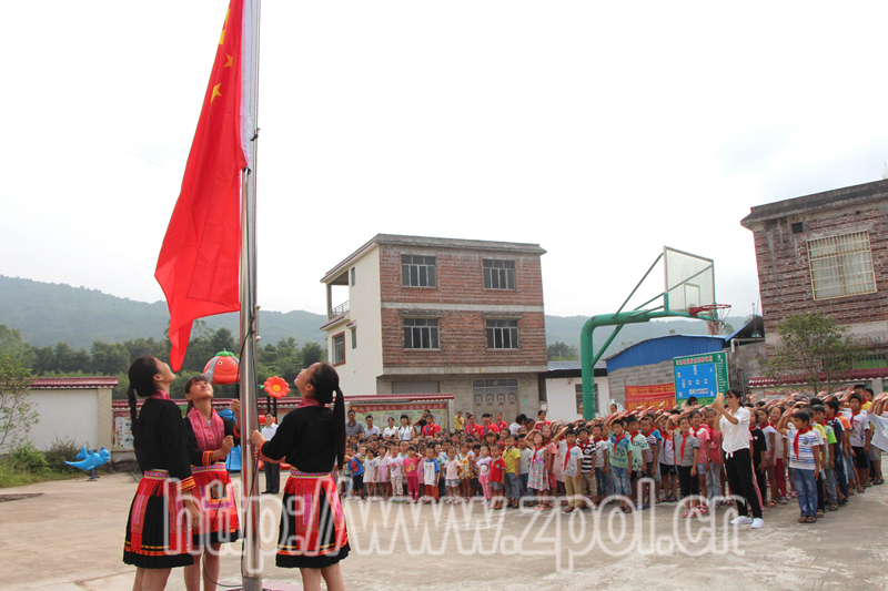 当天,伴着雄壮的国歌声,三名身着瑶族服饰的女生冉冉升起鲜红的五星红旗,少先队员昂首挺立向国旗敬礼,中学生、镇村干部、群众代表面向国旗行庄严的注目礼,大家共同庆祝中华人民共和国成立68周年。"国旗的颜色和红领巾的颜色是一样的,升国旗让我明白了幸福生活来之不易,为了中华民族伟大复兴的中国梦,我们要勤奋学习,为祖国做贡献。"古盘小学生农金婷说。
