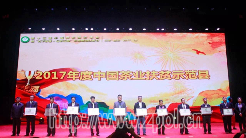 10月26日,由中国茶叶流通协会、云南省农业厅、云南省临沧市人民政府共同主办的"第十三届中国茶业经济年会暨‘天下茶尊•红茶之都’云南临沧红茶文化节"在云南省临沧市举行。开幕式上,我县被授予"2017年度中国茶业扶贫示范县"称号,并在会上受到表彰。