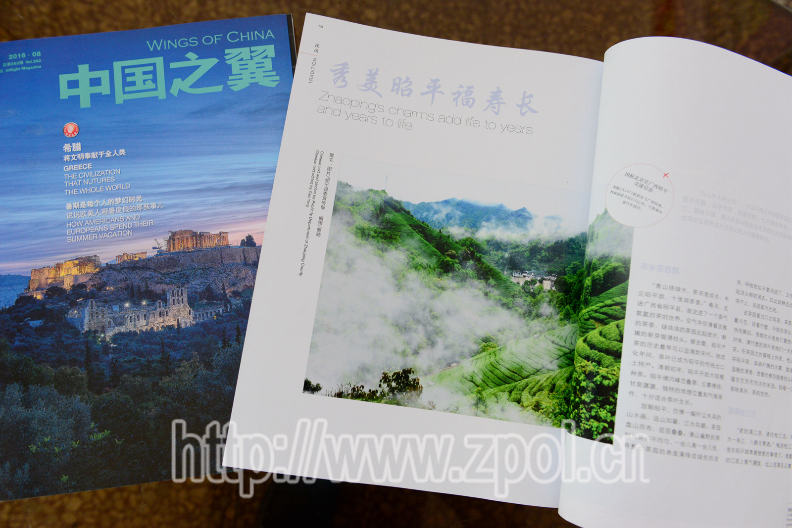 据悉,这是我县第三次登上航空类杂志,此前我县推介还两度登上中航集团航空双语月刊杂志《中国之翼》。在《中国之翼》第262期,杂志以《千年一梦到黄姚》为题,用汉英双语7页篇幅图文并茂地介绍了我县黄姚古镇历史人文和传统民俗,晒出了黄姚的各种美照;第268期,杂志以《秀美昭平福寿长》为题,6页篇幅细数了我县“因山而美,因水而魅,因茶而香,因景而醉”的特点,用语言文字、图片勾勒出昭平山水的超高颜值、老人的福寿绵长。