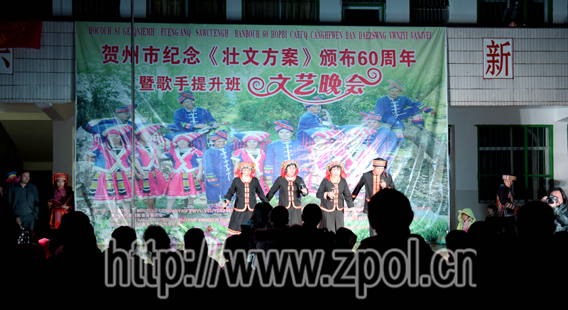 11月21日晚,"贺州市纪念《壮文方案》颁布60周年暨歌手提升班文艺晚会"系列活动在我县黄姚镇凤立壮族村举行。